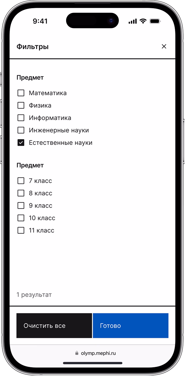 Олимпиады и конкурсы отобразили в виде карточек с ключевой информацией, а для ускорения поиска внедрили фильтры.