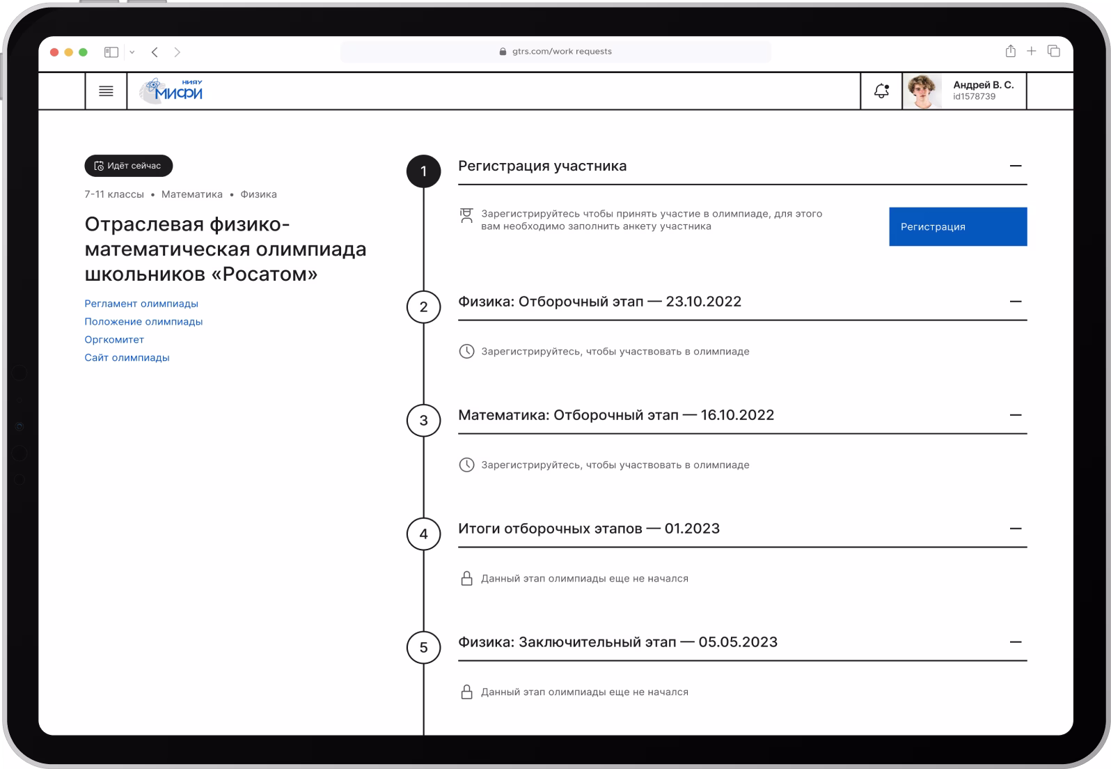 Разместили на страницах олимпиад и конкурсов основную информацию о мероприятиях — расписание этапов, заполнение анкеты участника, выбор подходящей площадки, отслеживание статуса и результата всех этапов.