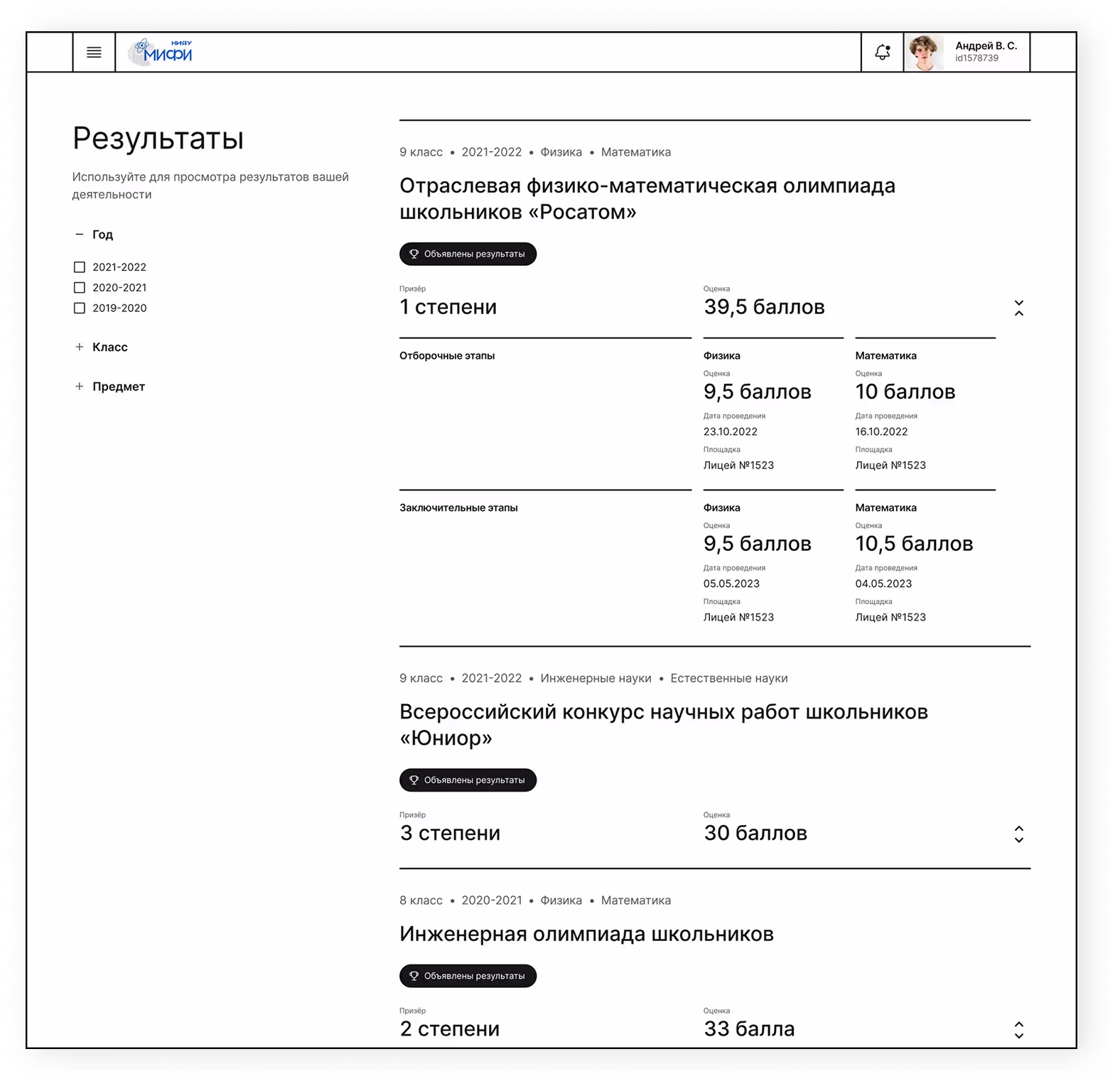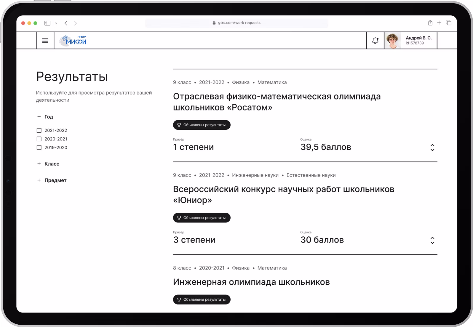 Отдельно выделили раздел для просмотра результатов. Здесь студенты и абитуриенты могут ознакомиться с итогами олимпиад и конкурсов, воспользоваться фильтрацией по разделу, посмотреть и скачать дипломы.